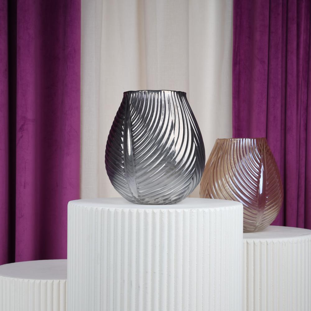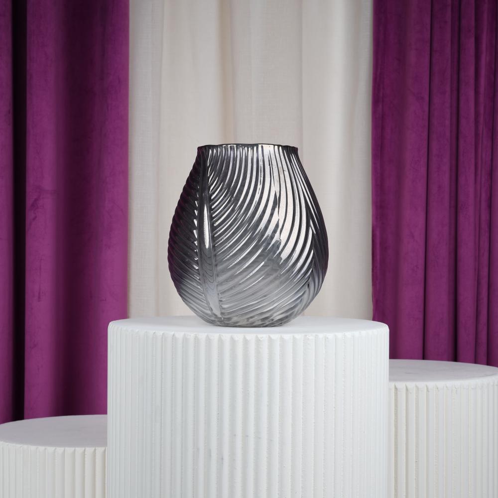 تتميز الفازة بلونها الرمادي الداكن وشكلها المستدير المموج، مما يضفي لمسة من الأناقة والحداثة على أي ديكور.
