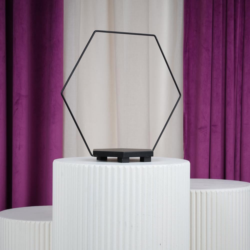 - التصميم: إطار خارجي من الحديد الأسود على شكل سداسي مع قاعدة خشبية مستوية.