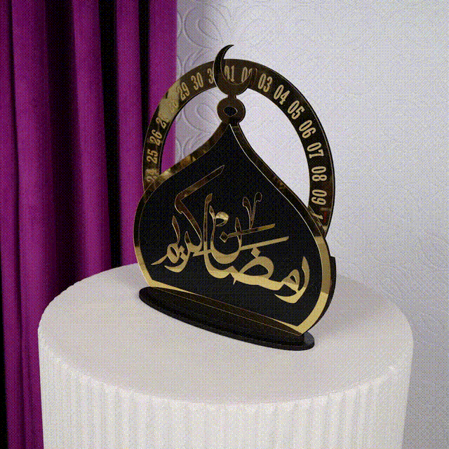 هذا الاستاند الأنيق المصنوع من الأكريليك هو قطعة ديكور فريدة من نوعها تجمع بين الأناقة والوظيفة، حيث يجمع بين تصميم الهلال والقمر الذي يرمز لشهر رمضان المبارك وتقويم متحرك يعرض أيام الشهر.