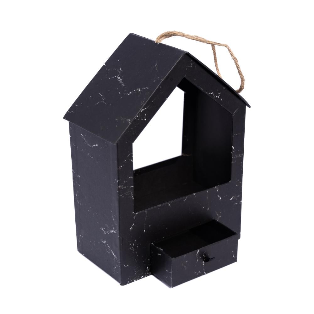 تصميم فريد ومبتكر: تتميز هذه العلبة بتصميمها الفريد على شكل منزل صغير، مما يجعلها قطعة ديكور جذابة وهدية مبتكرة. يأتي سطح العلبة بتصميم رخامي أسود أنيق، يضفي عليها لمسة من الفخامة والحداثة. وتحتوي العلبة على درج داخلي يمكن فتحه وإغلاقه بسلاسة، مما يوفر مساحة إضافية لتخزين الهدايا الصغيرة أو الحلي.