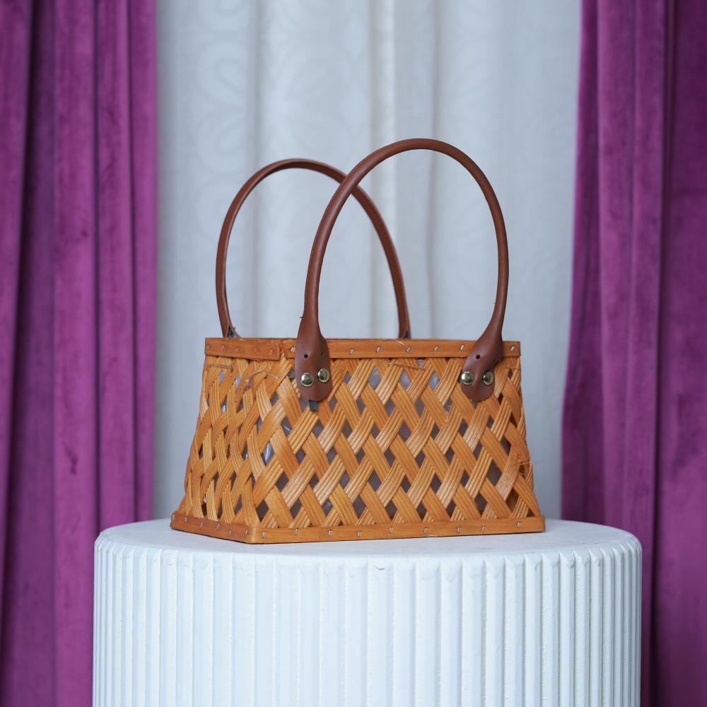 - المميزات:تصميم فريد: مصنوعة من شرائح خشبية منسوجة بشكل متقاطع، مع مقبضين من الجلد البني لإضافة لمسة عصرية وأنيقة.