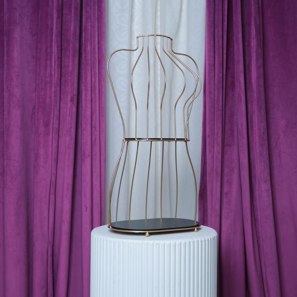 ستاند عرض مانيكان بتصميم عصري وفريد من نوعه، مصنوع من الحديد المتين باللون الذهبي الأنيق. يتميز بتصميمه المجوف الذي يشبه شكل مانيكان، مع قاعدة دائرية باللون الأسود. هذا الستاند قطعة ديكور رائعة تجمع بين الأناقة والعملية.