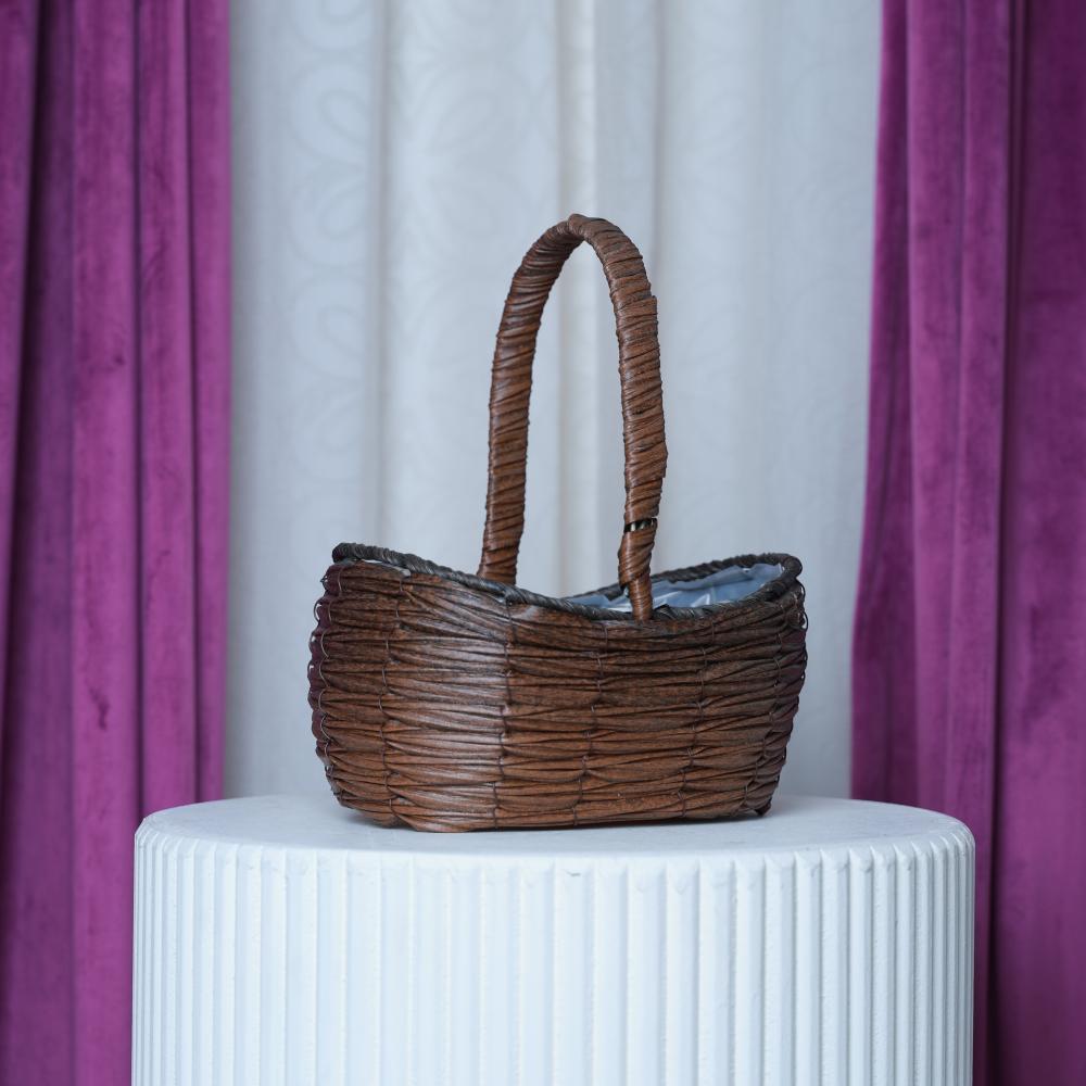 سلة خزف أنيقة بتصميم بيضاوي ولون بني غامق، تتميز بلمسة فنية مميزة من خلال سطحها الخارجي المموج الذي يشبه النسيج. هذا التصميم يمنحها مظهرًا فريدًا يجمع بين الأناقة والبساطة.