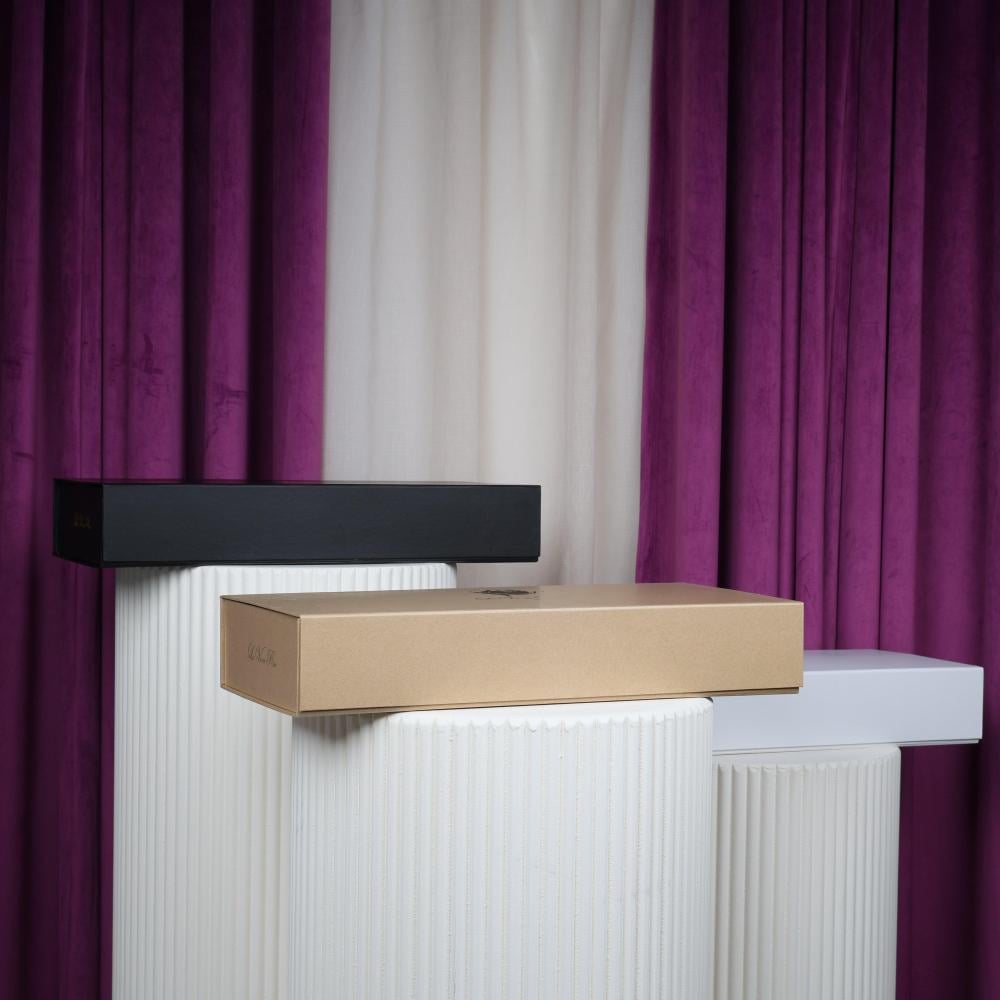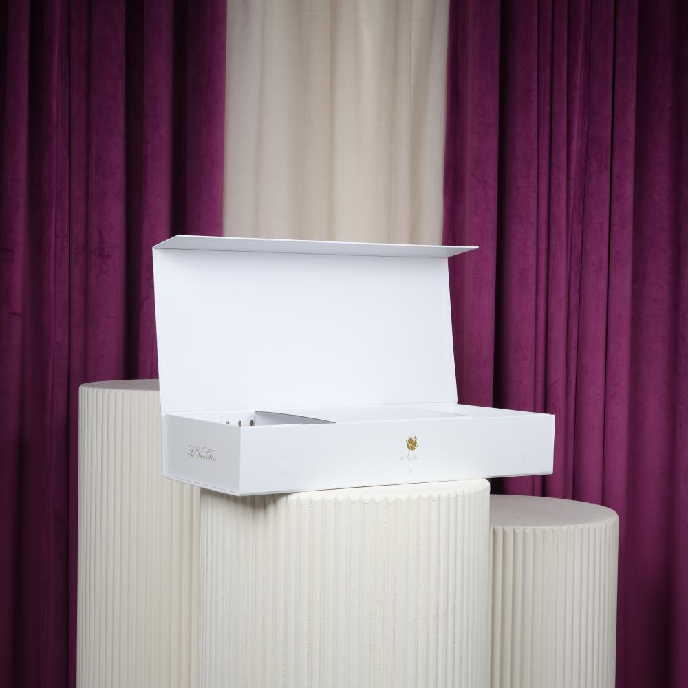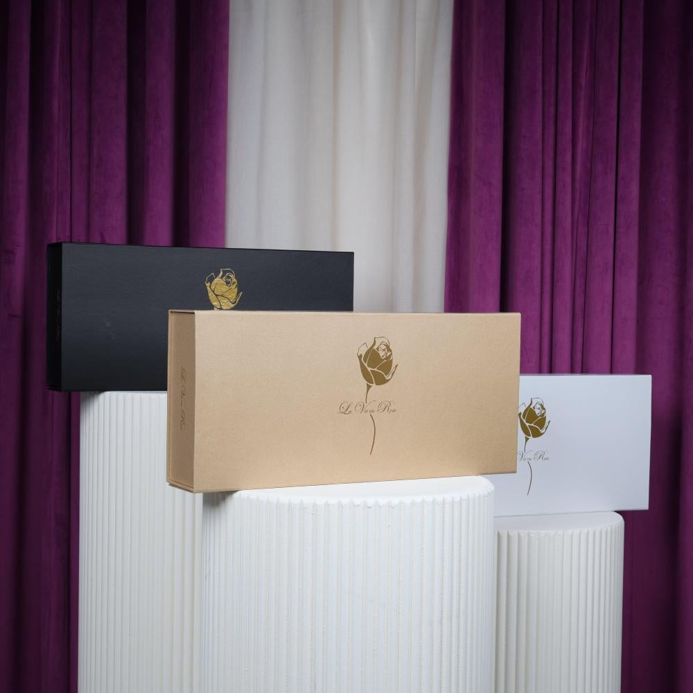 تتميز علب الورد هذه بتصميمها الأنيق والعصري، حيث تجمع بين الشكل المستطيل الكلاسيكي والتصميم الأنيق للغطاء. هذا التصميم يضفي لمسة من الفخامة والرقي على الهدية ويجعلها أكثر جاذبية ومثالية لحمل باقات الورود الكبيرة والمتوسطة الحجم، وتوفر تهوية وحماية كافية للساق والبرعم.