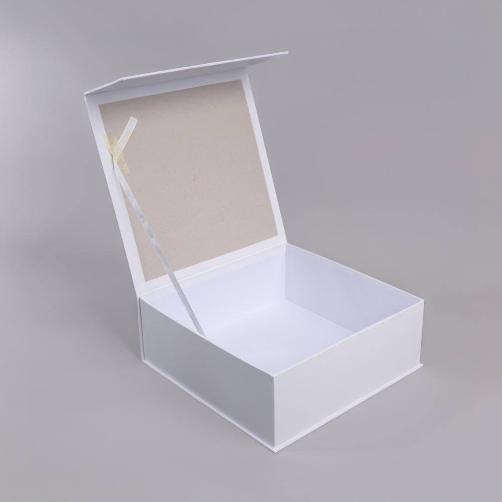 علب مربعة بيضاء مصنوعة من الكرتون المقوى، مزودة بقفل مغناطيسي ، يمكن استخدامها لتقديم الهدايا ولتخزين أي شيء من المجوهرات والإكسسوارات وغيرها .
