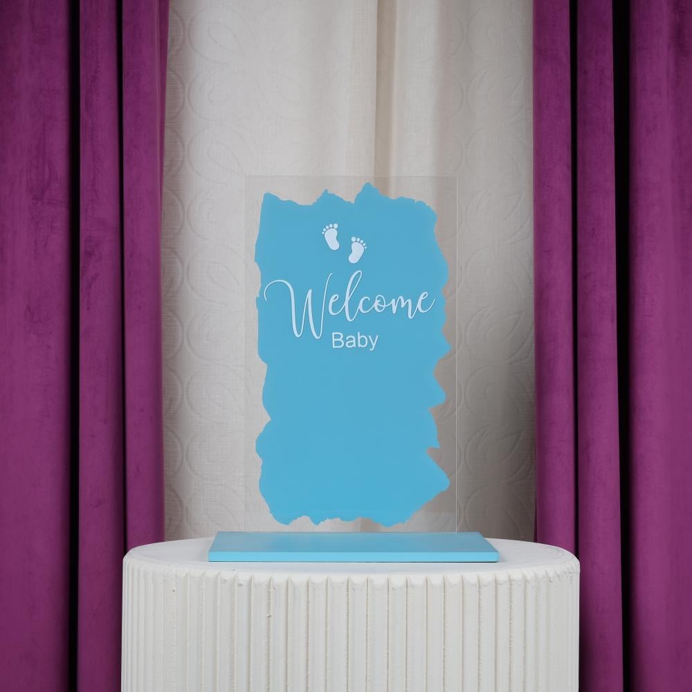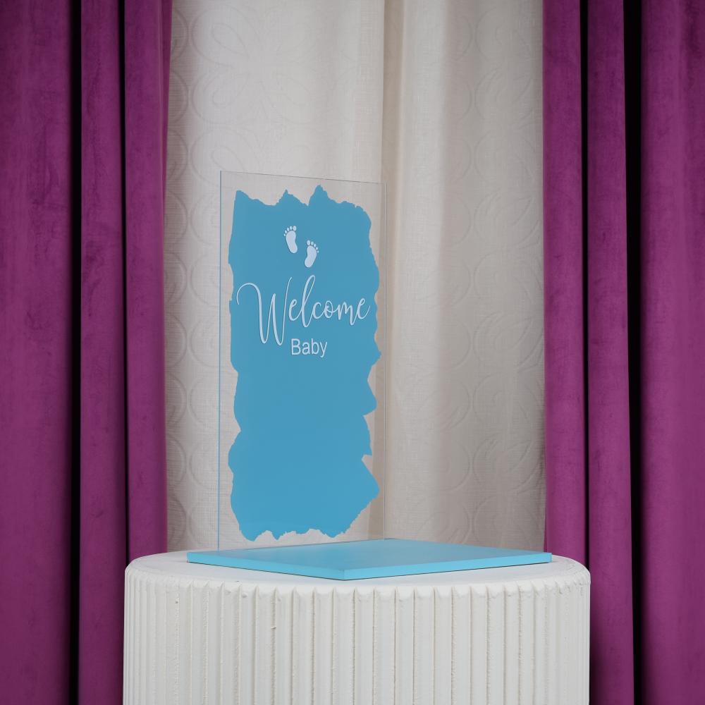 هذا الاستاند الأنيق المصنوع من الأكريليك الشفاف والسماوي هو الإضافة المثالية لحفل استقبال مولودكِ. يتميز بتصميمه الجذاب والعصري، حيث يجمع بين الأناقة والبساطة. يأتي الاستاند مزينًا بكلمة "Welcome Baby" ورسومات أقدام صغيرة بلون سماوي، مما يجعله قطعة ديكور مثالية لإضفاء لمسة من الرقة والجمال على حفلتكِ.