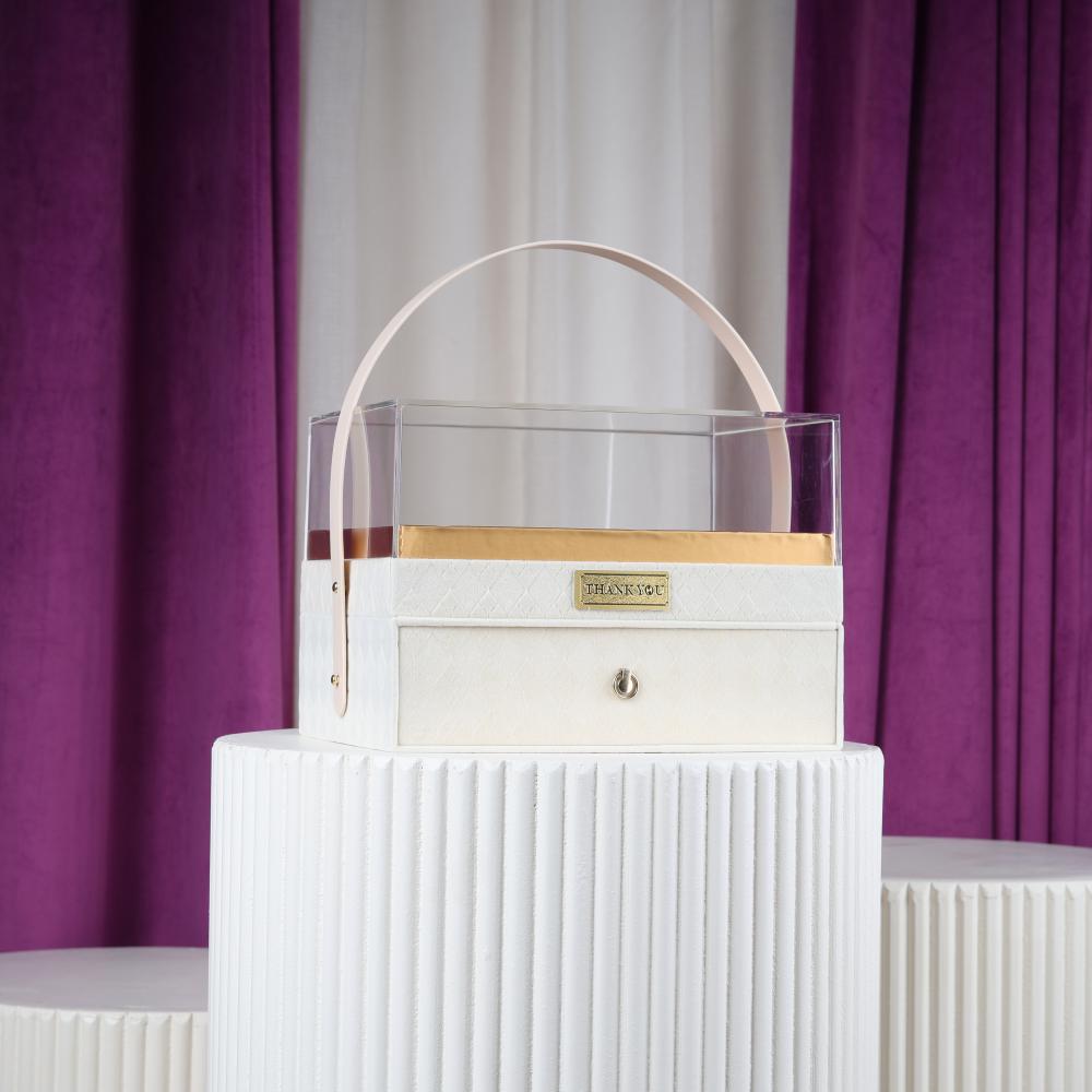 علب مخمل بيج أنيقة: علب مستطيلة الشكل مصنوعة من المخمل الفاخر باللون البيج ، تتميز بغطاء أكريليك شفاف يبرز ما بداخلها. تحتوي العلب على درج داخلي بسحاب لتخزين الأشياء الصغيرة. تصميمها الكلاسيكي والأنيق يجعلها مميزة للهدايا والديكورات .