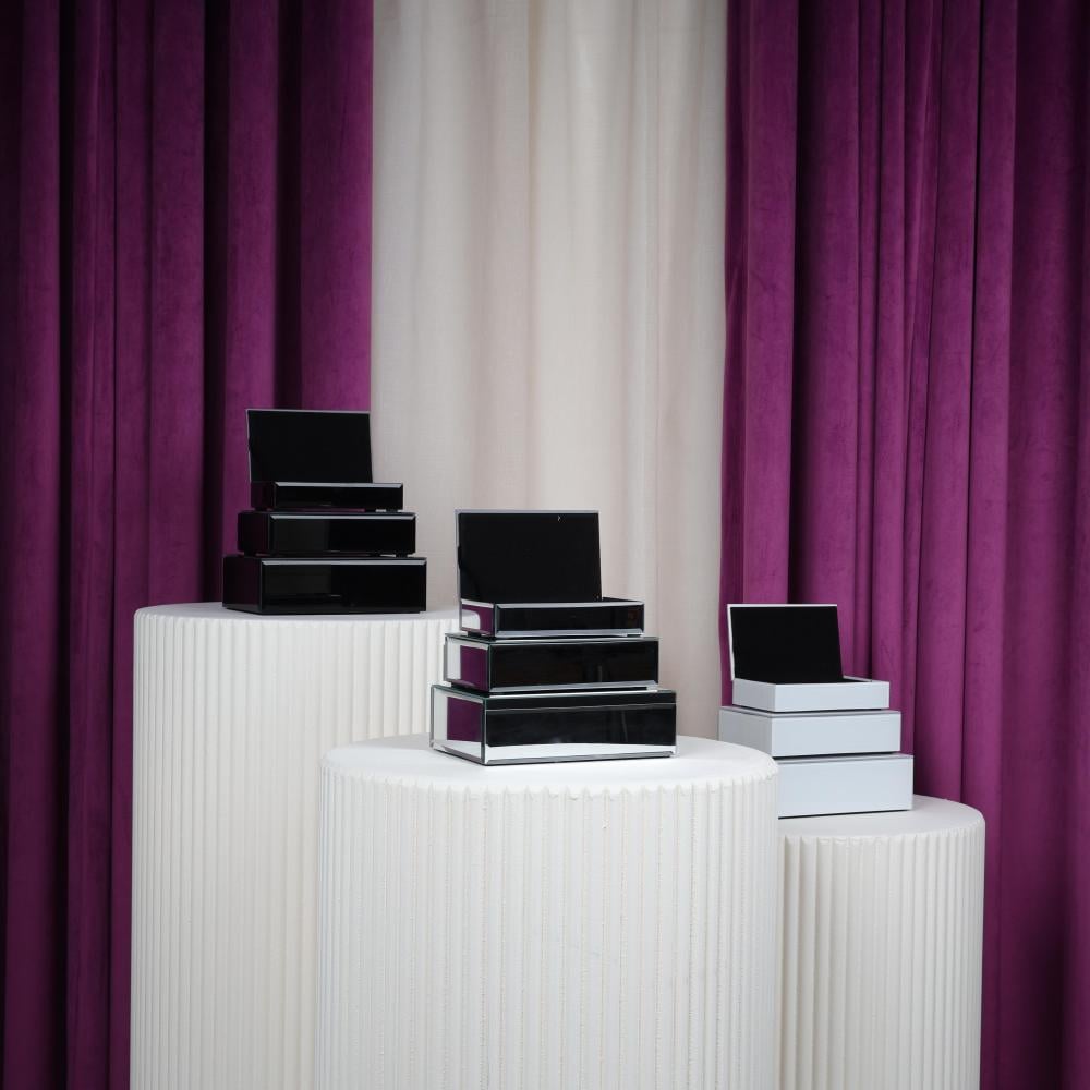 - جودة عالية ومتانة: مصنوعة العلب من زجاج عالي الجودة وبطانة مخملية من الداخل، مما يضمن متانتها وقدرتها على الحفاظ على محتوياتها. كما أن المرايا المستخدمة في التصميم تعطي انعكاسًا واضحًا ونقيًا.
