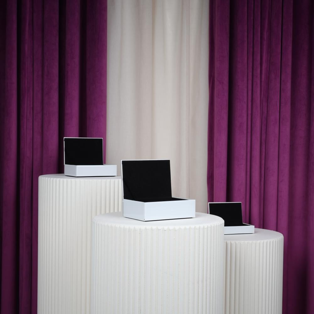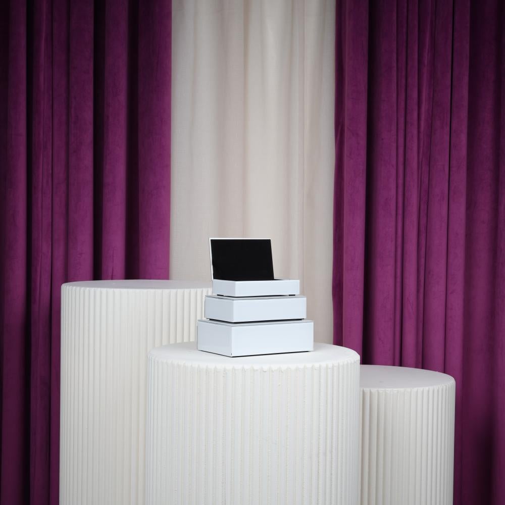 يتميز هذا الطقم بتصميمه العصري والأنيق، حيث تجمع العلب بين الشكل المستطيل الكلاسيكي واللمسة العصرية للمرآة. هذا التصميم يضفي لمسة من الرقي والأناقة للهدايا وعلى أي مكان يتم وضعه فيه ومثالية لتخزين الاكسسوارات والخواتم أو الأقراط الصغيرة.