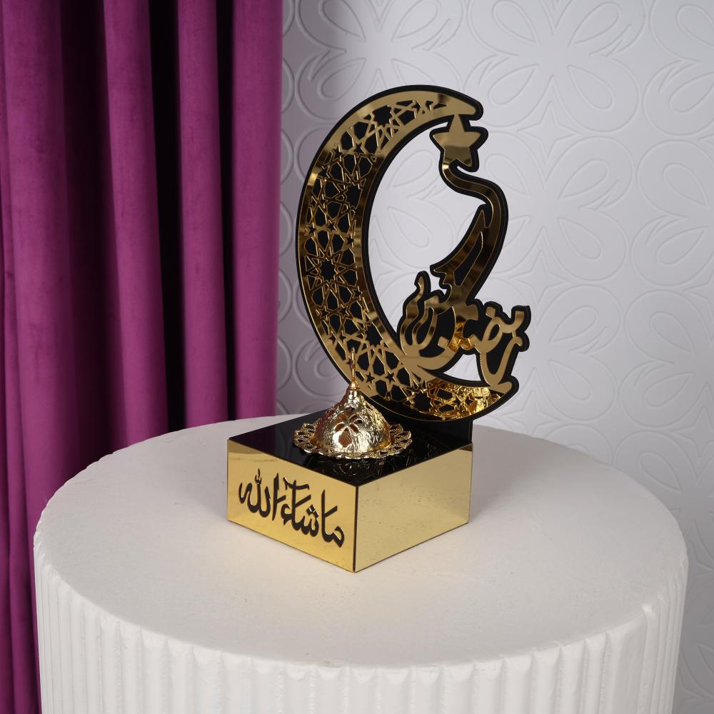 This elegant Ramadan crescent-shaped incense burner is a unique decorative piece that adds a touch of luxury and spirituality to your home during the holy month of Ramadan. Featuring an attractive design that combines glossy acrylic with elegant Arabic calligraphy of the word "Ramadan," it is a truly unique piece of art.
