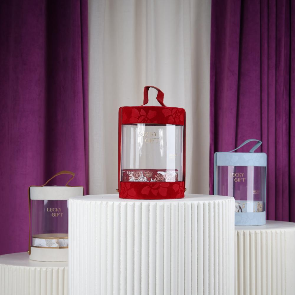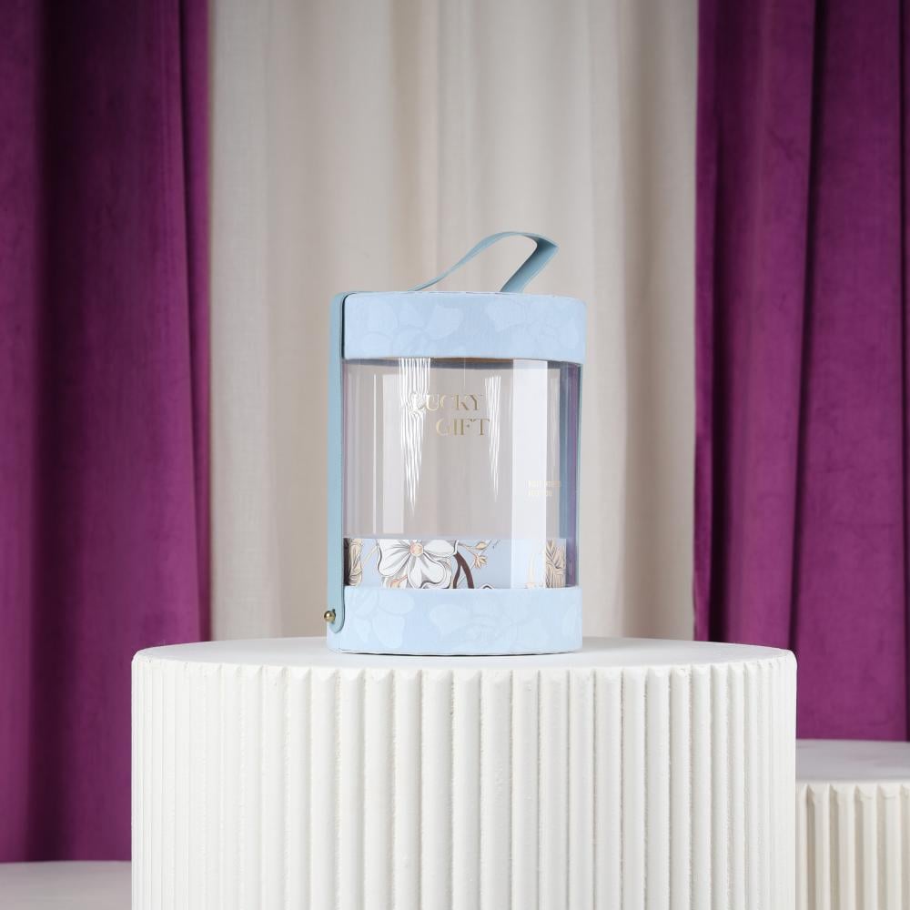 Sky Blue Round Gift Boxes: These round boxes feature a modern, elegant design made from high-quality materials. They feature a lid and handle that enhance the beauty of the gift inside, and a soft velvet base in attractive colors. They're ideal for gifting on special occasions.