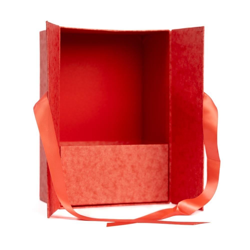 An elegant and distinctive red gift box with a built-in lid and satin ribbon, specially designed to add a touch of luxury to your gifts. This rectangular box features a sleek and simple design that is suitable for various occasions, whether it is a birthday, wedding, or any other special occasion.